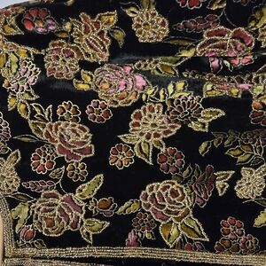 Elegant black blazer with intricate gold floral embroidery. Perfect for formal occasions. Features a classic round neckline and open front design.