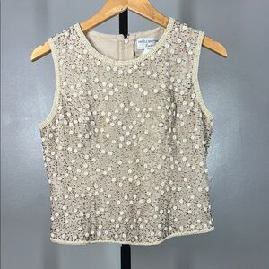 This sophisticated crop tank top from Papell Boutique features a cream base with gold embellishments, creating a stunning shimmer effect. The intricate beaded design adds a touch of elegance, making it perfect for special occasions. With its fitted cut and waist-length style, this top is both chic and stylish. Back zipper that zips all the way down so you don’t mess up your hair . This top is beautiful and in excellent condition. No beads missing and no tears