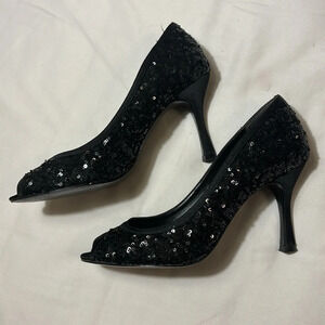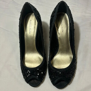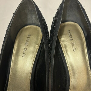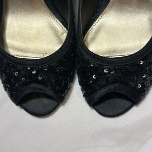 Papell Studio Peep Toe Heels Size 8 Mesh Satin Sequin 3 Inch Heels Black