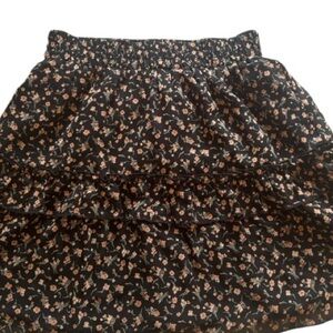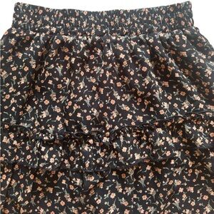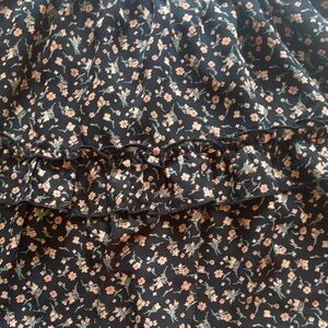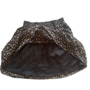 Features: fully lined, elastic waist, black with small floral print in white and tan
