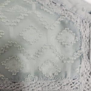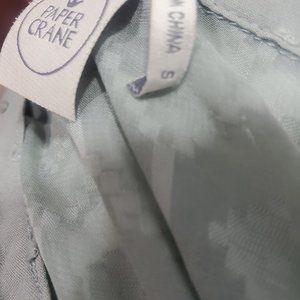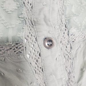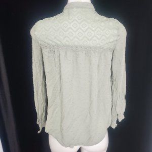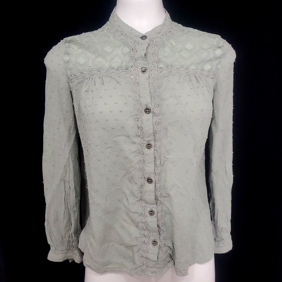 Paper & Crane, Viscose with textured Dot Fabric and Embroidered Lace, Button Up Blouse, Sage Green, Long Sleeve, Metal buttons, Size Small.