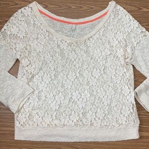 Ivory lace on the front and ivory knit back and sleeves. Unique and great over a camisole. No stains or holes. See photos for approx measurements.