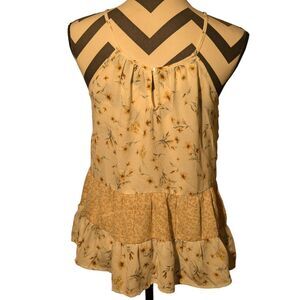 Float through summer days in effortless style with this charming paper crane tiered floral tank top! The moment you see its delicate yellow flowers scattered across a light cream background, mixed with a coordinating denser floral print in the middle tier, you'll feel an immediate pull to its sweet, carefree spirit. Designed with slender spaghetti straps and a playful ruffled hem, this top offers a light and airy feel, perfect for sunny adventures. A subtle keyhole front with a button adds a touch of delicate charm. Imagine pairing this with your favorite denim shorts for a picnic in the park, a flowing maxi skirt for a bohemian look, or simply enjoying its comfortable breeze on a warm afternoon. You deserve clothing that feels wonderfully light and looks effortlessly pretty. This isn't just a tank top; it's a feeling of serene comfort, an expression of summer joy, and an irresistible addition to your wardrobe that promises compliments wherever you go!