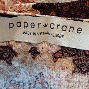 Cute sleeveless top from Paper Crane. Neutral pattern (medallions?) with a bit of a ruffle around the bottom hem. Colors are cream and muted browns/reds. Lightweight and stretchy. Size Large; measures about 18 inches between the pits and 17 inches long.