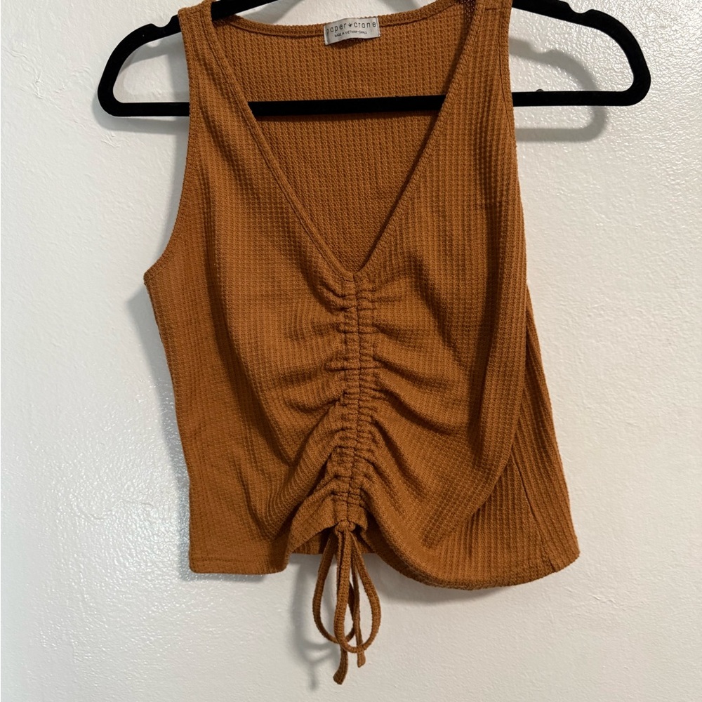 Chic ribbed tank with ruched front. Sleeveless design. Perfect for layering or wearing alone.