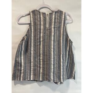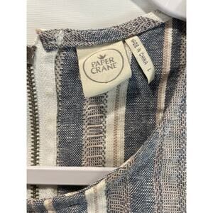 Women's sleeveless blouse by Paper Crane in size Large. Features a round neckline, back zipper closure, and soft lined print in blue, white, and gray.