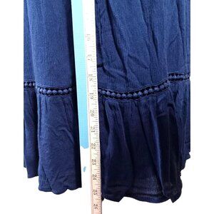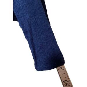 Elegant navy blue dress by Paper Crane for women. Features an off-shoulder design, spaghetti straps, and long flare sleeves. Size small.