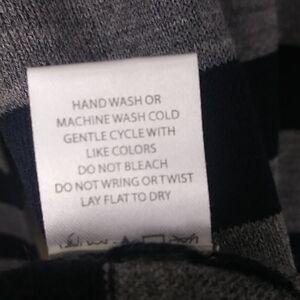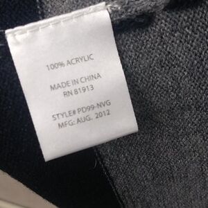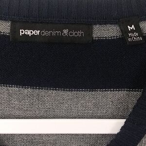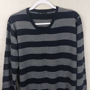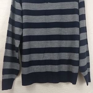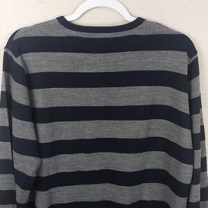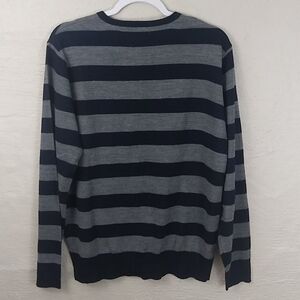 Paper Denim & Cloth Men's Dark Blue Gray Wide Striped V-Neck Long Sleeve Light Weight Pull Over Sweater. 100% Acrylic. Ribbed Knit V-Neck, Cuff Hem Detail. Measurements approx. Flat Lay. Pit to Pit: 22, Sleeve: 25, V-Neck: 4.5,