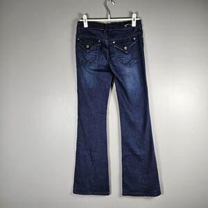 These blue flare low rise pants are made of a comfortable cotton blend fabric and feature a stylish button back pocket and zipper closure. The bootcut style and size 27 waist make these jeans a perfect fit for any occasion.