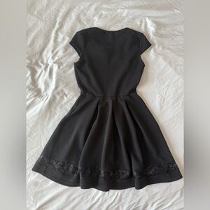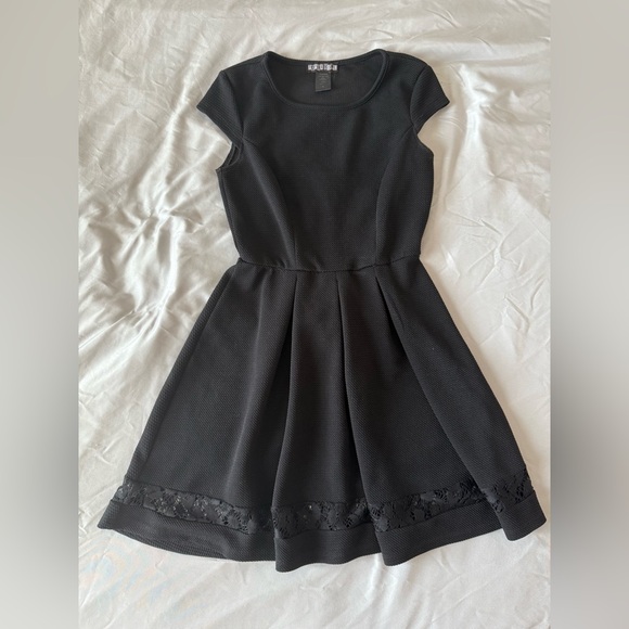 This chic black mini dress by Paper Doll features a flattering A-line silhouette with a pleated skirt and a classic crew neck. Designed with cap sleeves, it's perfect for cocktail parties or a night out, offering a blend of elegance and style.