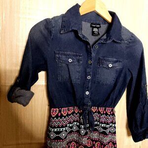 Paper Doll girl’s mixed material denim and silky high low southwestern dress 7. Gently used condition. Measurements are: 29” from shoulder to shortest part of hem, and 15 ½" from armpit to armpit.