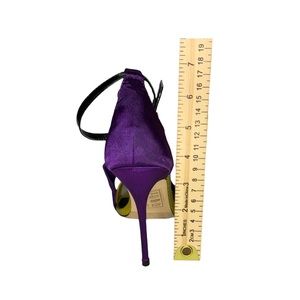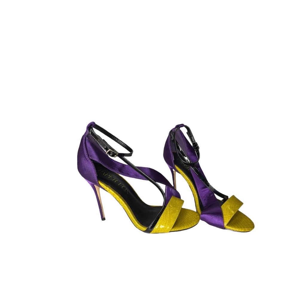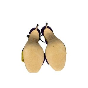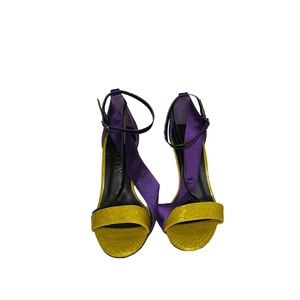 Shiny strap heels. Purple side is a satin like material and the yellow side is a vinyl like material. Slightly sparkly.