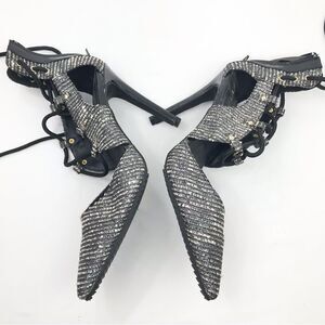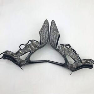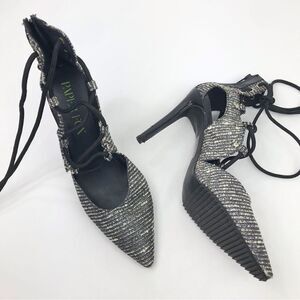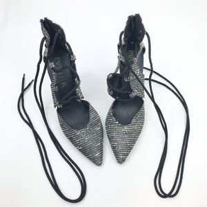 Paper Fox Shoedazzle Black Cream Metallic Tweed Pointed Toe Lace Up Heels