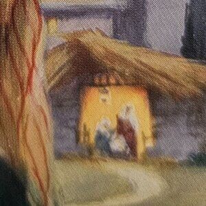 Front of Card: 3 Shepherds point to the Star of Bethlehem, in the distance the Holy Family can be seen in the stable
