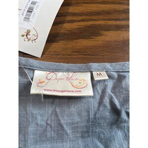 Paper Lace light blue tree quarter bell sleeved embroidered crocheted top size Medium NWT. Has b-neck. Crocheted around edge of sleeves and bottom hem. Embroidered on top. Drop waist and flared. Jokes going all around bottom. Made in India.