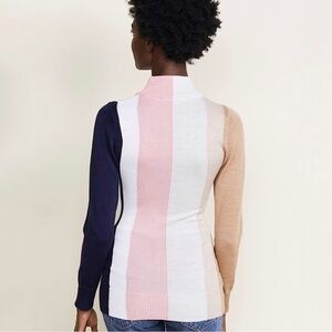 Paper London Dolly Wool Jumper Tonal Stripe Mock Neck Fitted Sweater in Pink / Ivory / Tan / Navy. Size tag has been removed, measurements suggest an XS.