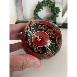 This Tiger Christmas tree ball will be a great addition to any African themed Christmas tree or decor. It can be used on a tree, on garland, hanging from a chandelier, sitting in a bowl on a table or in a large clear vase or jar. A true conversation piece. It is hand made and designed of a bright red resin product with paper mache tiger and then embellished and highlighted by the hand painted trim. There is a loop a the top of the ball with gold metallic cord and attached tassel for hanging. It is light in weight.
