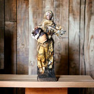 Paper Mache Mexican Folk Art - Peasant Woman Standing Holding Clay Pot. 11" tall x 5" wide x 4" deep