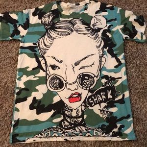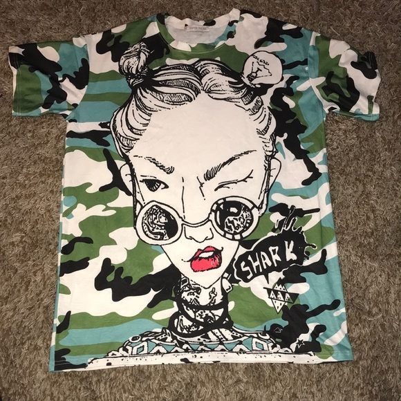 Green, blue and white camouflage short sleeve t-shirt