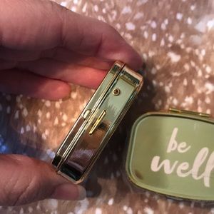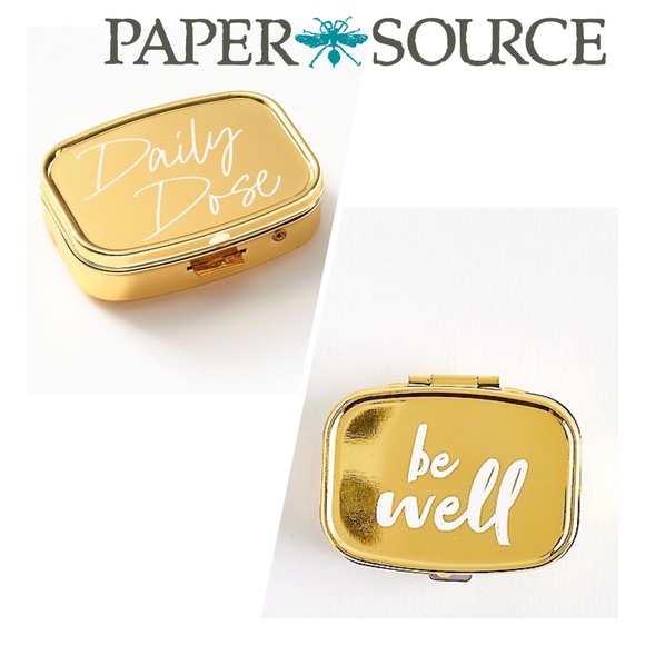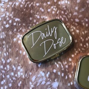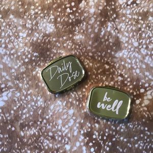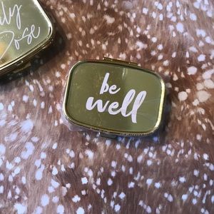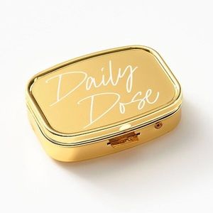 Keep your vitamins and minerals with you on the go in this cute gold supplement case that reminds you to “be well” and take your “daily dose”