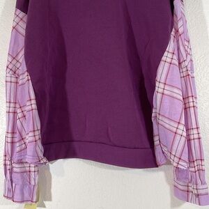 Deep purple colorblock style flannel/pullover combination sweater. Flannel style sleeves with pockets and Sleeves buttons. V-neck style pullover middle with thick, high quality material.