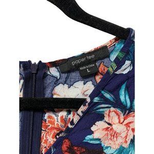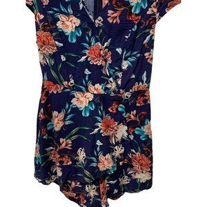 Cute women's Paper Tee romper , size large, floral pattern. Size L. Faux wrap front with a v-neck and cap sleeves. The colors are mainly blue, red, and white. Measurements to measurements: armpit to armpit - 16", length - 29"