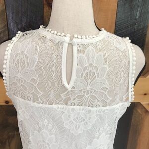 Paper + Tee sleeveless peplum top. Sheer lace neckline with crochet trim, lined body with lace overlay. Scalloped bottom, size S. Button keyhole closure in back. 100% nylon. Super cute to dress up or down!!Approximate measurements are pit to pit flat 17”, length from shoulder approximately 26”.