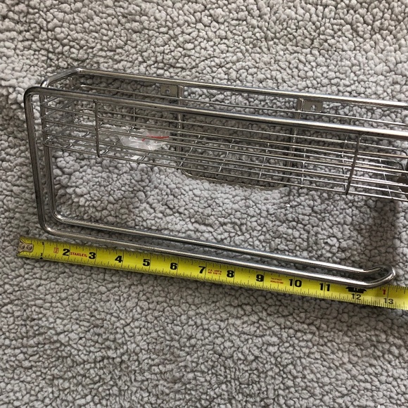 It is about 12 1/2 inches long. It fits a standard paper towel roll. The spice rack sits directly above and will fit normal sized spice bottles. It may fit the bigger refills if you turn them to the side but I didn’t have any to check. It comes with the screws to hang it. I never installed.