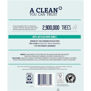 Let’s be real – life gets messy. Seventh Generation 100% Recycled Paper Towels* get the job done with its strong and absorbent design, but not at the expense of our forests. Seventh Generation paper towels are made from 100% recycled paper* with 85% post consumer recycled paper and whitened without chlorine bleach. Our right-sized sheets allow you to use only what you need - for big messes or just a napkin. Seventh Generation recycled paper towels are tough on messes and easy on our world. For more than 25 years, Seventh Generation has been thoughtfully formulating safe and effective plant-based products that work. Really well. Seventh Generation Free & Clear 100% recycled* paper towels and toilet paper are made with no added dyes, inks, or fragrances. Our Free & Clear paper is Forest Stewardship Council certified as FSC Recycled* (FSC C115279).