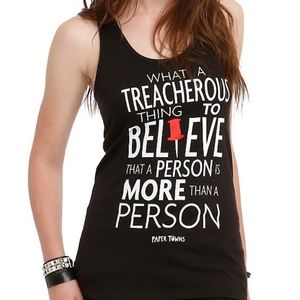 Black racer back tank top from Paper Towns with quote design that reads "What A Treacherous Thing To Believe That A Person Is More Than A Person."