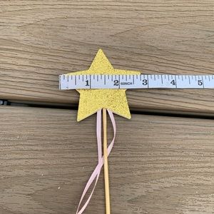 A gold glittery wand I used as party favors for my daughter’s princess birthday. The wand measures almost 11” tall and the star is almost 3” wide. Two pieces of pink ribbon are attached under the star. New.