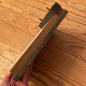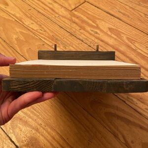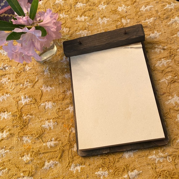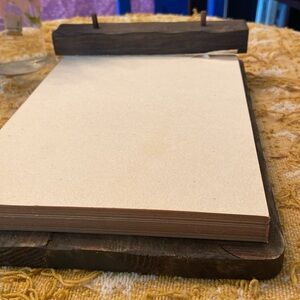 Rustic, vintage-looking wooden tablet paper holder. Comes with a large stack of natural, raw-looking paper