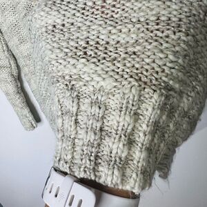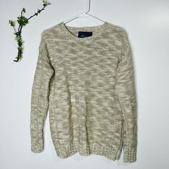 Flecks of silver metallic thread woven into this creamy oatmeal colored sweater.