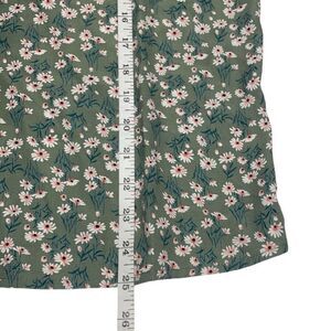 Features and details: sage green, ditsy floral design on front only, pleated v neckline, short rolled-hem cuffed sleeves, lightweight, jersey material on back with button detail along center back
