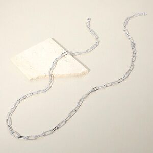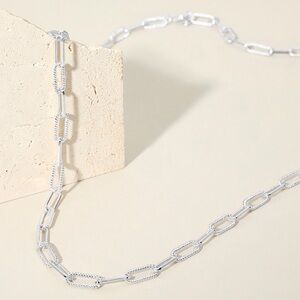 • Modern rectangular link necklace with alternating smooth and textured segments, offering a sleek, contemporary accent for any outfit.