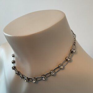 This sleek choker necklace features a polished silver finish and a contemporary paperclip chain design, embelished with stones