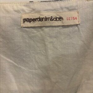 Paperdenim&cloth blouse. Used in good condition. One small spot of yellowing but could likely find a way to get it out(as seen in picture up. close and then a comparitive photo not zoomed in). Sophisticated fabric and lining. Fitted bodice with A-line taper.