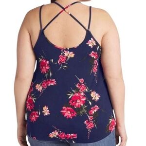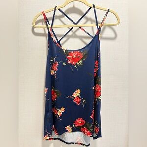 Strappy fun detail cross over spaghetti straps X pattern in straps on back. Navy blue floral pattern Lots of stretch and lightweight.