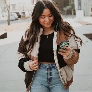 This Papermoon bomber jacket is a stylish and unique piece! The color block design in nude, brown, and black is eye-catching and versatile.