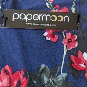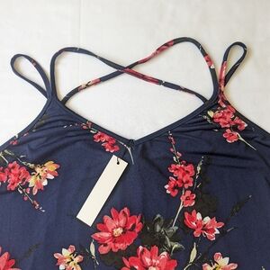 Stylish Papermoon tank top. Features vibrant red floral pattern on navy background. Perfect for casual wear.