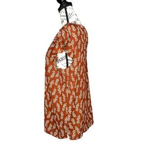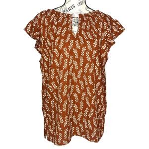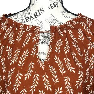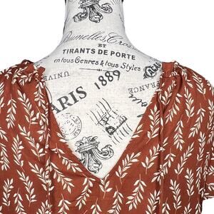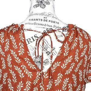 Breezy and feminine, this short-sleeve blouse features a charming leaf print on warm brown fabric. The ruffled sleeves and flowy silhouette create easy elegance, while the keyhole detail and tie back add a subtle touch of style. Lightweight and airy—perfect for sunny days or layering under your favorite jacket.