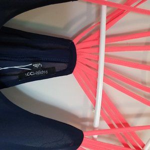This is a beautiful top. It is a sheer blue with great vibrant coral straps.