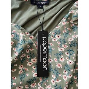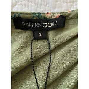 The Papermoon Women's Ellie Cap-Sleeve Floral Top in green combines comfort and style. Made from a soft mix of polyester, rayon, and spandex, this V-neck top is perfect for casual outings or semi-formal events. Easy to pair with jeans or skirts. New with tags (NWT). Comes from a smoke-free home.