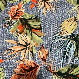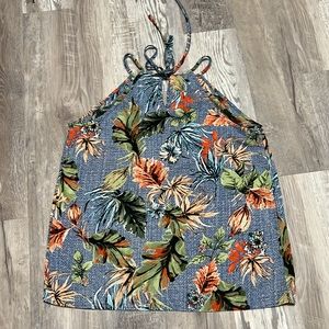 Papermoon Tank Size M. Ties around the neck, creating a key hole in the back. There is a key hole in the front. Blue with green and peach palm leaves. Pit to Pit measures 20”.