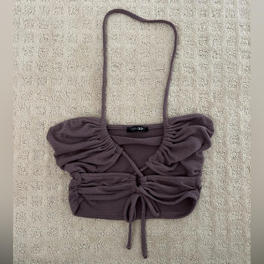 Brown terry cloth cropped top with cut-outs. Can be easily adjusted for fit.In perfect condition, only worn once!