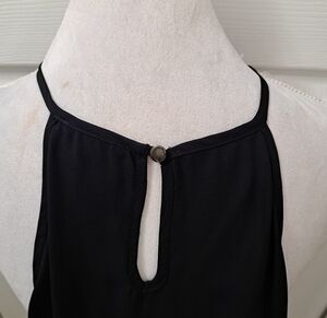purchased but never worn, semi sheer halter neck, spaghetti straps, three oblong cutouts below the neck, very flowy, keyhole in back with a button closure, 100% polyester, pit to pit 23" length 24.5"