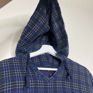 Adorable dress by Papermoon new with tags. Dress has a window pane plaid pattern in shades of black and blue. Hooded with drawstring. Waist has a ruffle that extends all the way around. Slight swing trapeze fit. Can either be worn as a dress or tunic. Great go to piece! All measurements are approximate and taken flat.