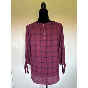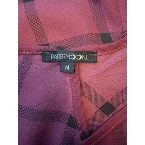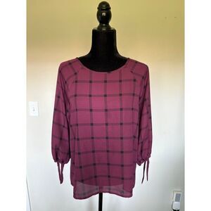 Papermoon Womens Crimson & Black Plaid 3/4 Sleeve Blouse With Back Zipper & Tie