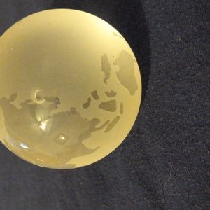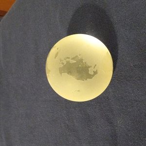 glass paperweight with the continents etched in it flat bottom. It looks yellow in the pictures but it's clear.
