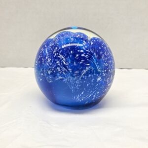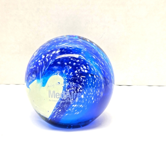 The MedAire Ocen Wave Paperweight is a beautifully crafted glass paperweight featuring a stunning blue color and an ocean wave-themed design. This unmarked paperweight is a unique and elegant decor piece that will add a touch of the sea to any space. The intricate wave design and vibrant blue hue make it a standout piece.
